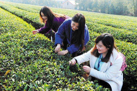 在長沙云游茶業綠色茶園里,姑娘們享受著采茶的樂趣。
